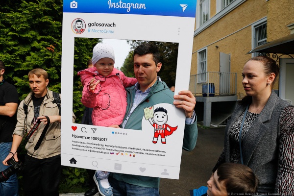 На улице, где уже выстроилась пресса для подхода, Алиханова встречают разве что не с караваем. Вместо последнего на врио буквально надевается рамка «голосовача».