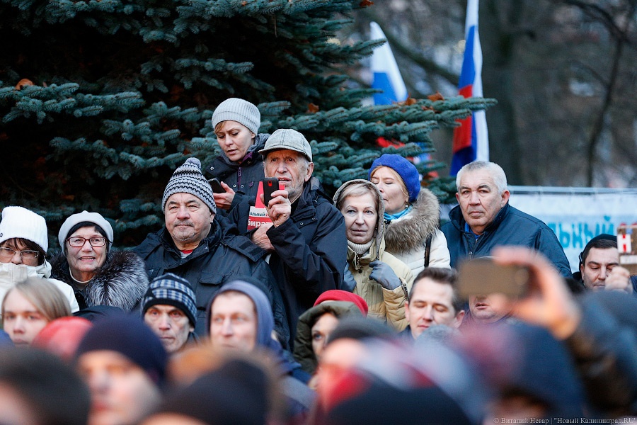 Взобравшись на сцену, Алексей Навальный заявил, что митинг в Калининграде — «самый крутой», и начал рассказывать, как изменится жизнь, если он станет президентом. «На вас смотрит вся страна!» — говорил он толпе. Та одобрительно гудела.