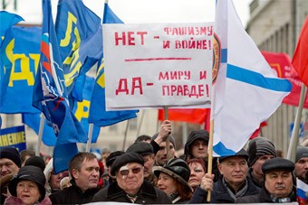 — Но есть то самое информационное воздействие, которое можно контролировать. Есть многотысячные митинги, которые проводились не потому, что абстрактный школьник Петя пришёл к маме и сказал: «Хочу, мочи нет, пойти митинговать за Крым», — и мама подала заявку, и всей семьёй они пошли на площадь Победы. Функции контроля есть. Но на тех же митингах я видел совершенно пограничные проявления, совсем шизоидные лозунги. Один дедушка пришёл с плакатом «Польша первая проститутка США после Англии, Литва — вторая. Патриот, ни ногой в Польшу и Литву!».