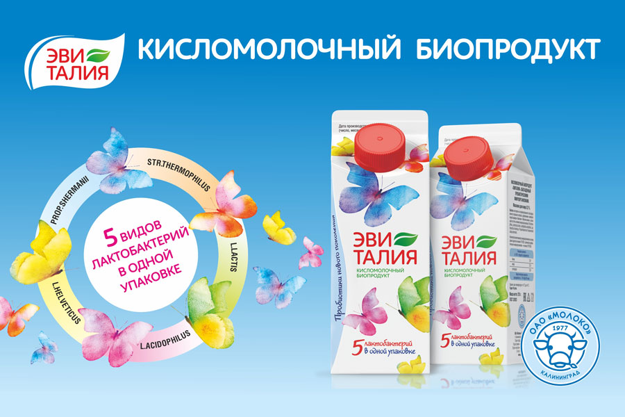 Именно поэтому специально для калининградцев компания ОАО «Молоко» разработала уникальный кисломолочный биопродукт «Эвиталия», созданный на основе натуральной симбиотической закваски, изготовленной научно-производственной фирмой «Пробиотика».