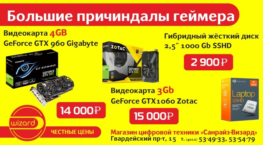 Поэтому, чтобы ты мог порадовать заинтересованных барышень, да и просто с удовольствием порубиться в новейшие игрушки на «максималочках», большой магазин любой цифровой техники «Санрайз-Визард» на Гвардейском, 15, подготовил для тебя парочку забойных видеокарт с внушительным объемом видеопамяти и, как всегда, по честной цене: