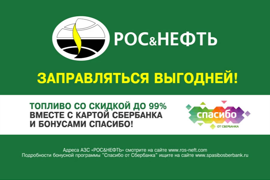С 15 октября 2016 года на АЗС «Рос&Нефть» при оплате топлива картой Сбербанка вы получите 3%* бонусами СПАСИБО и возможность обменять накопленные бонусы на скидку до 99%**.
