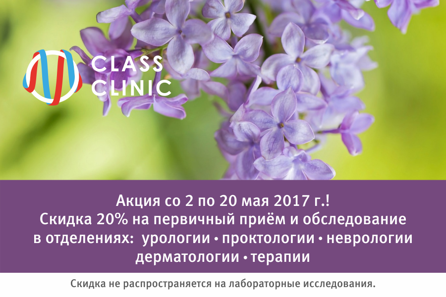 В медицинском центре Class Clinic по 20 мая действует скидка 20% на первичный приём и обследование при записи к врачам в следующих отделениях: