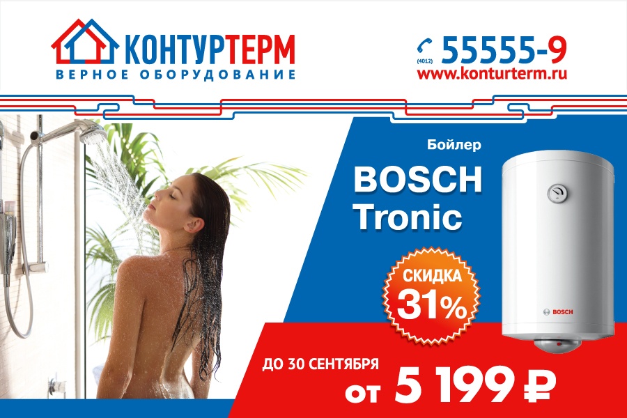 Электрический водонагреватель BOSCH Tronic от «Контуртерм» станет незаменимым помощником в быту! В условиях частых для Калининграда отключений горячего водоснабжения он поможет избежать неудобной ситуации и обеспечит всю семью большим запасом горячей воды!