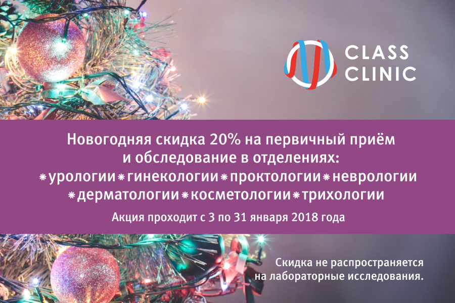 С 3 по 31 января при обращении в медцентр Class Clinic вы получаете скидку 20% на первичный приём и обследование в следующих отделениях: