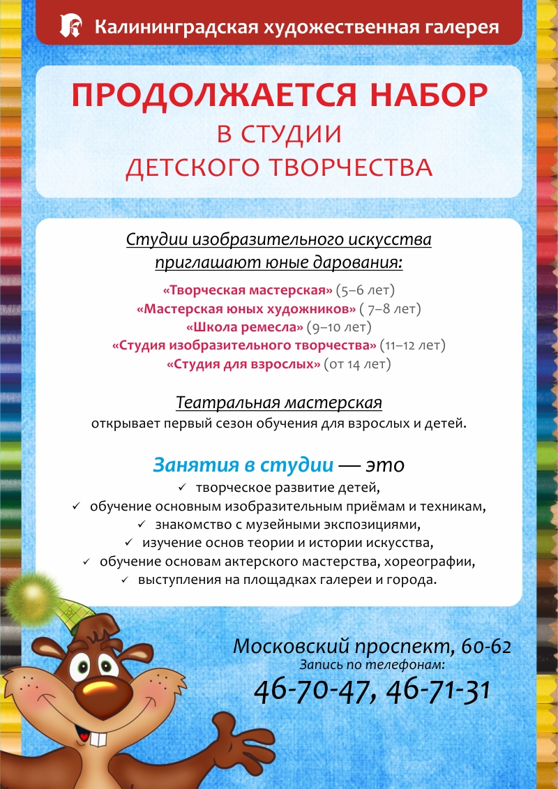 Калининградская художественная галерея приглашает юных друзей от 4 до 12 лет в студии детского творчества.