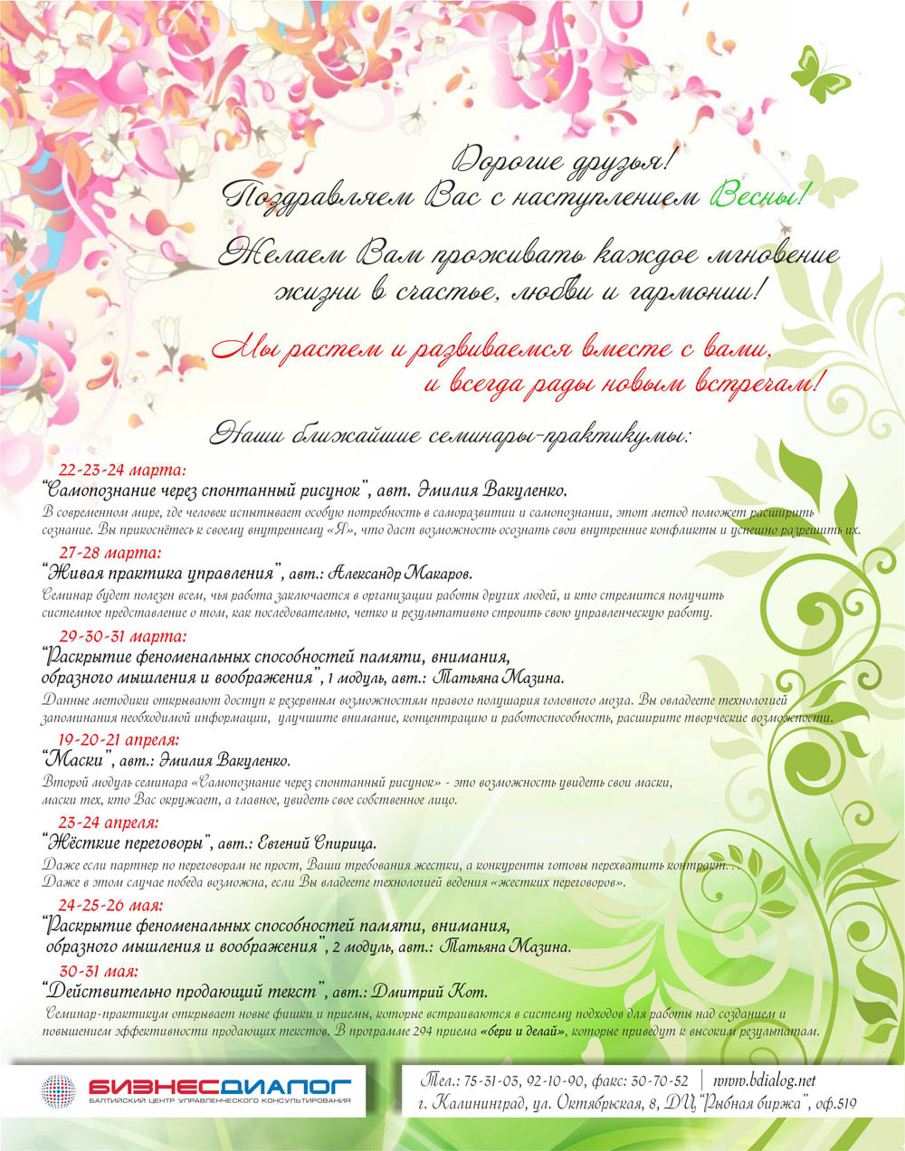Мы искренне поздравляем вас с наступившей весной! Вот и настало, наконец, время перемен, расцвета, пробуждения новой жизни, яркого солнца, ясного неба и пусть пока еще прохладного, но такого приятного легкого ветерка! Ветер перемен обновил и наши с вами отношения, сделал их более простыми и еще более приятными. И именно весной мы дарим каждому участнику любого нашего семинара 2 часа бесплатного индивидуального коучинга! *