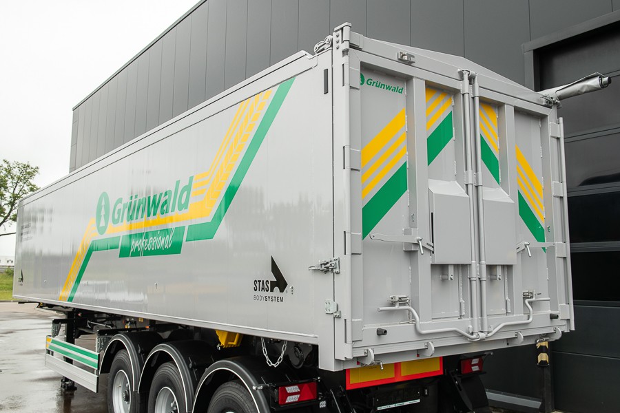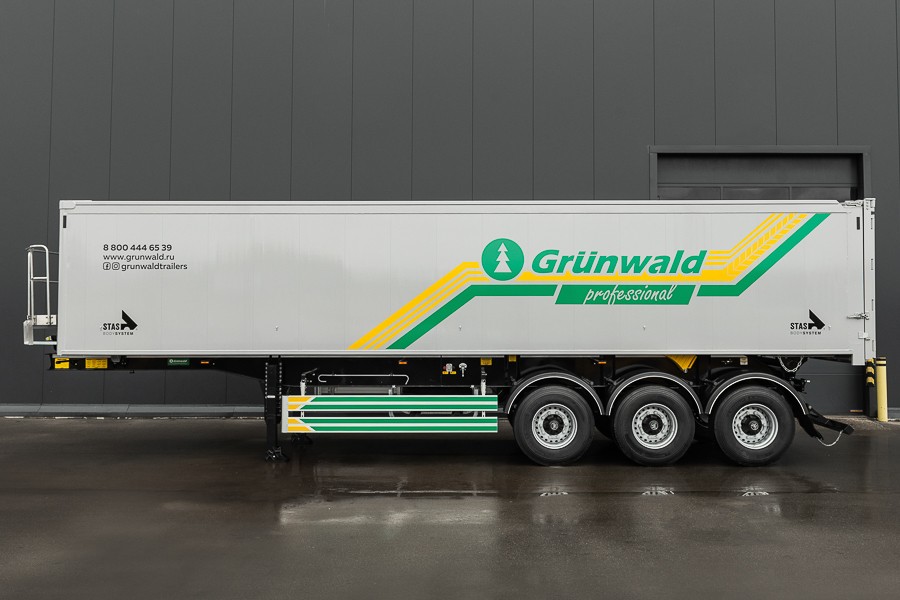 Сегодня представлена новая модель самосвального полуприцепа с алюминиевым кузовом коробчатого профиля, объемом 49 куб.м. На стадии технического проектирования конструкторскому бюро Grunwald удалось добиться сочетания высокой надежности и прочности с наименьшей порожней массой полуприцепа в 7 000 кг.