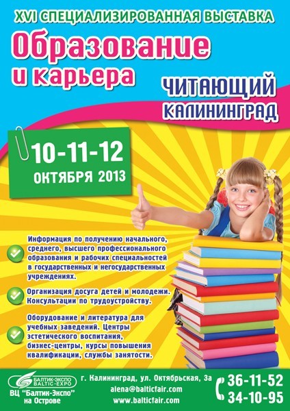 Во время выставки можно будет получить информацию о рынке труда в Калининградской области, проконсультироваться у специалистов Центра занятости, пройти профессиональное тестирование, получить информацию о курсах повышения квалификации. Желающие заниматься изучением иностранных языков увидят демонстрацию всего спектра услуг и новых авторских методик языковых центров и школ. Кроме этого, выпускники, планирующие получить образование за рубежом, узнают о возможностях и перспективах европейского образования и карьеры.