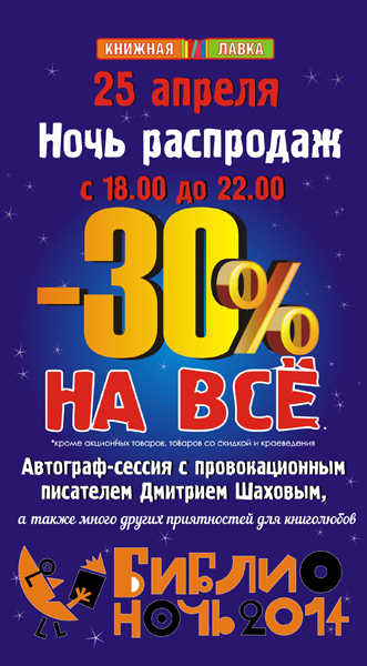 А в магазине, расположенном на Ленинском, пр., 103 в 18:00 пройдет автограф-сессия с провокационным писателем Дмитрием Шаховым, который живет в Калининграде, является основателем и директором вебстудии «Ремарка» и слывет главным блогером-хулиганом рунета.