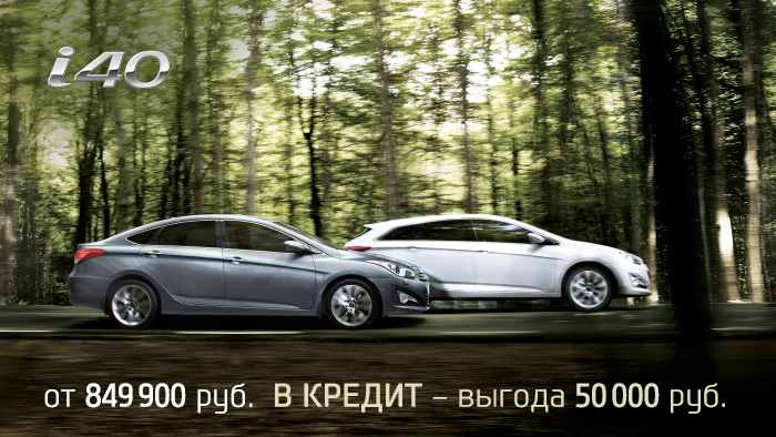 Субсидия 50 000 рублей предоставляется покупателю в виде снижения стоимости автомобиля при покупке седана или универсала i40 в кредит по программе Hyundai Finance*. Стоимость седана i40 в базовой комплектации Comfort 1,6 MT — 849 900 руб., без учёта скидки. При покупке в кредит с помощью программы Hyundai Finance — 799 900 рублей. |