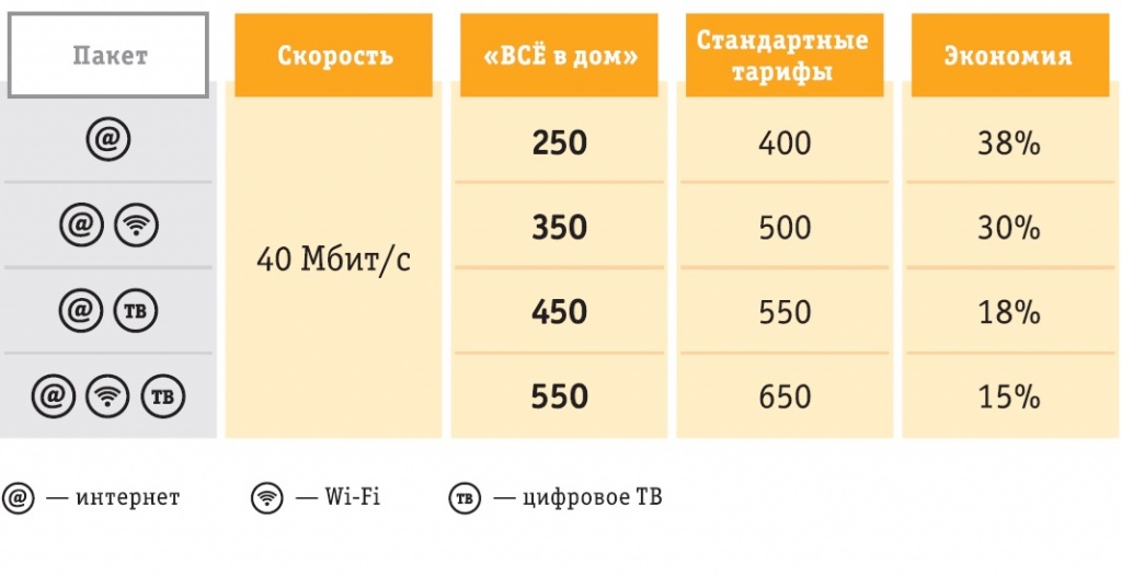 Пакетные предложения включают самые различные сочетания услуг проводного интернета, цифрового телевидения и Wi-Fi. Наиболее полным являются пакетное предложение за 550 рублей в месяц, приобретая которое клиент получает все перечисленные выше услуги. Также есть возможность приобрести Домашний интернет за 250 рублей в месяц, Домашний интернет и Wi-Fi за 350 рублей в месяц, Домашний интернет и телевидение за 450 рублей в месяц. Скорость доступа к сети Интернет с 09:00 до 01:00 составит до 40 Мбит/с, с 01:00 до 09:00 увеличивается до 80 Мбит/с.