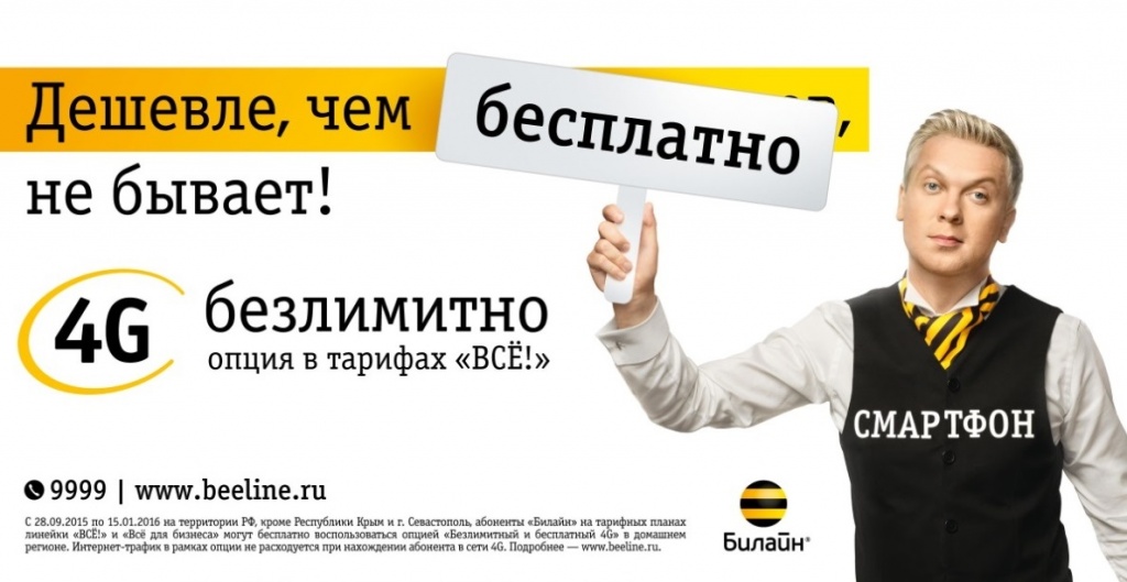 ПАО «ВымпелКом» (бренд «Билайн») запускает акцию «Безлимитный и бесплатный 4G» на тарифах популярной линейки «Всё!» и «Всё для бизнеса». Предложение действительно для всех владельцев смартфонов в городах присутствия 4G/LTE «Билайн» в России.