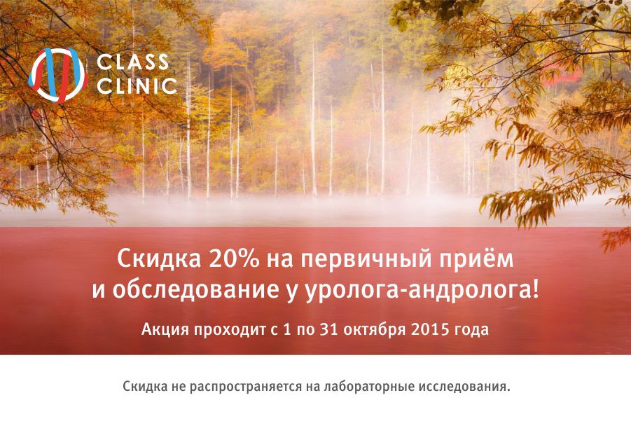 В медицинском центре «Class Clinic» действует скидка 20% на приём и обследование в отделении урологии. УЗИ предстательной железы, УЗИ мочевого пузыря, аппаратурная диагностика (по показаниям), приём и консультация врача стоят всего 760 рублей: http://class-clinic.com/urologiya.