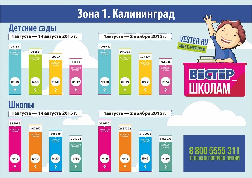 Именно эти оказались самыми упорными и целеустремлёнными, благодаря чему почти сразу попали в рейтинги голосования. Однако по правилам этого года главных победителей будет всего 11: 4 компьютерных класса школам, которые займут 1-е места в своих зонах, и 7 интерактивных мультимедийных досок — детским садам-лидерам и школам, что займут вторые места.