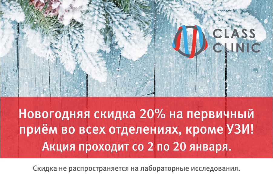 Со 2 по 20 января при обращении в любое отделение (кроме УЗИ) Вы получаете скидку 20% на первичный приём и обследование!