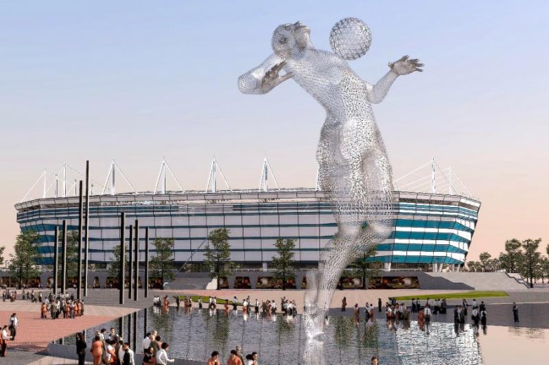 «Стадион будет открыт на совершенно пустом острове. Максимум, что мы там увидим — может, Солнечный бульвар, какое-то мощение и засеянная травой поверхность песка», — сказал Копылов. По его словам, это будет фигура, «вырывающаяся из воды — фигура футболиста с мячом». «Пришла идея соорудить ее из сетки. На входе в стадион проектом предусматривается сооружение водной глади метров 90, такой большой водоем, и на ней стоит, вернее летит, бежит футболист», — пояснил архитектор. Внешний вид и размер скульптуры пока окончательно не определены — сделаны лишь предварительные наброски. Нет пока и расчётов стоимости сооружения и источников финансирования. Фигуру планируется подсветить или даже провести туда воду.