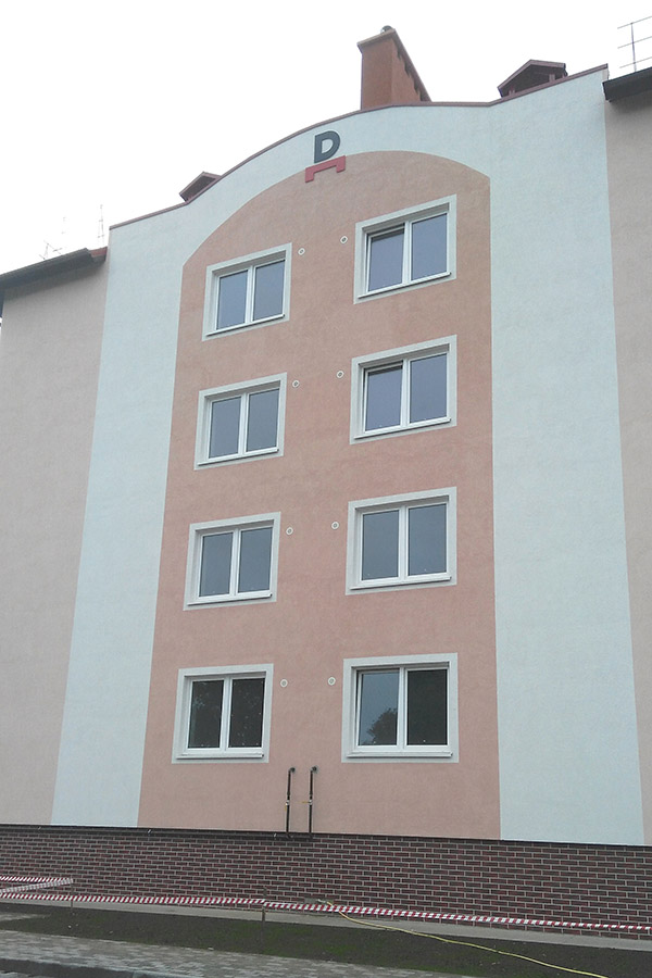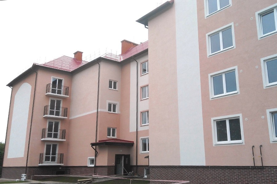 Компания возводит 4-этажный многоквартирный дом в г. Гурьевске. Изучив их документацию, мы приходим к выводу, что срок сдачи дома в эксплуатацию до 30 апреля 2017 г., а передача квартир запланирована до 31 июля 2017 г. К нашему удивлению, на сегодняшний день дом полностью построен. Перед нами статно возвышается кирпичный красавец, «одетый» в нежные персиково-бежевые тона. Кровля под стать дому — красного цвета с коричневым оттенком, эффектно играет на солнце. Нижняя часть дома облицована клинкером коричневого цвета с белой расшивкой, благодаря чему он кажется таким легким и даже воздушным.