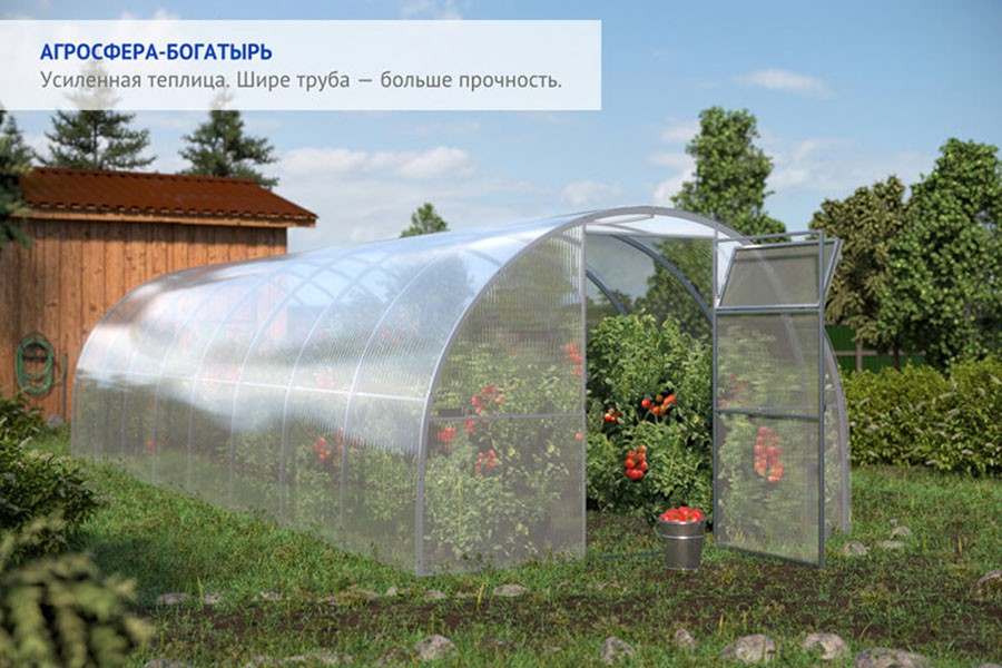 В конструкции теплицы «Богатырь» используются стальные несущие трубы с сечением — 20×40 мм, причем труба изогнута «на ребро». Такой каркас выдерживает снеговую нагрузку до 130 кг на м2 (соответствует примерно 50 см свежевыпавшего снега). А в сверхпрочной теплице «Титан» вдобавок к этому увеличена частота внутренней обрешетки со стандартных 1000 мм до 670 мм — подобной конструкции не страшны ни аномальные снегопады, ни ураганы. При этом вне зависимости от выбранного клиентом типа компания по его требованию произведет теплицу любой площади, начиная от 12 м2 (4×3×2 м).