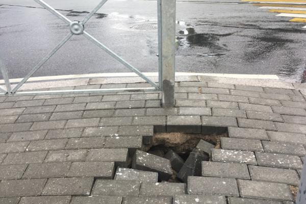 В Калининграде на перекрёстке улиц Октябрьской и Багратиона около Высокого моста провалилась свежеуложенная тротуарная плитка, передаёт корреспондент «Нового Калининграда». Провал расположен около пешеходного перехода на Багратиона.
