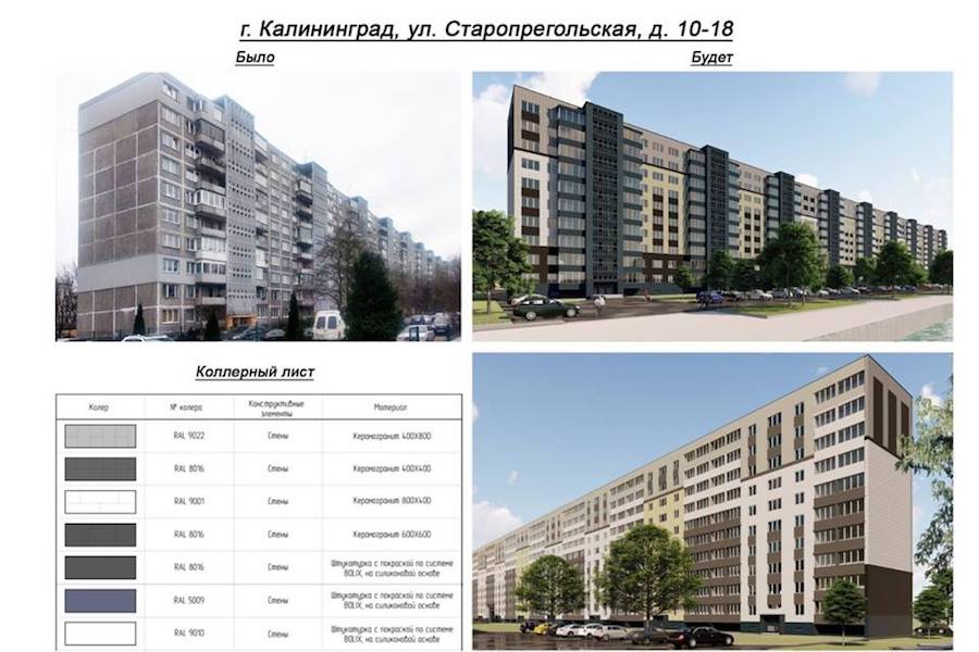 Оксана Астахова говорила корреспонденту «Нового Калининграда», что эти дома не собираются стилизовать «под старину», как это было с хрущевками на Ленинском проспекте, а планируют придать им «совершенно новый облик».