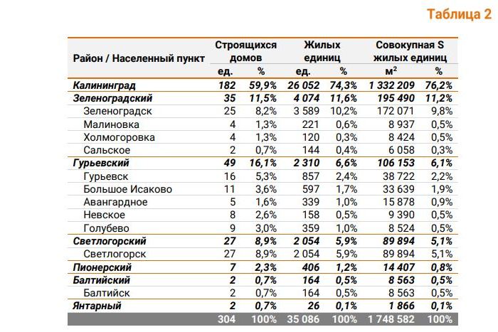 Строительство идёт в 7 муниципалитетах — в Калининграде, Зеленоградске, Гурьевске, Светлогорске, Пионерском, Балтийске и Янтарном. Причём три четверти строящегося жилья (по площади) приходится на Калининград. На втором месте идёт Зеленоградский городской округ — 11,2%.