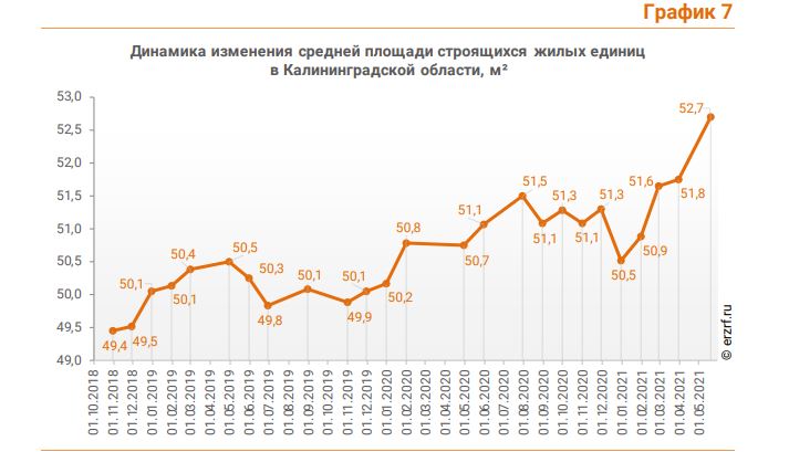Средняя площадь квартиры в строящемся доме в мае 2021 года составила 52,7 м². В мае 2020 года средняя площадь квартиры в новостройке составляла 50,7 м².