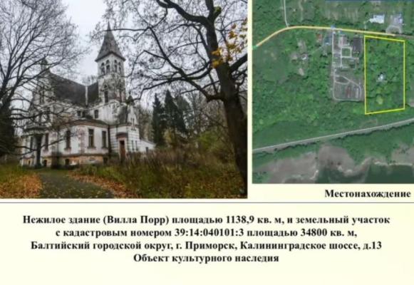 — вилла Порр в Приморске Балтийского городского округа, переданная Министерством обороны РФ в собственность области. Ее площадь — порядка 1 тыс. кв. м, площадь участка — 3,5 Га;