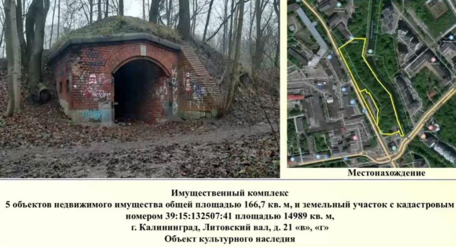 — казарма оборонительной крепости Кронпринц на ул. Литовский вал, 38, в Калининграде. В состав входят 4 объекта общей площадью 15 тыс. 452 кв. м. Площадь участка — 19 тыс. 212 кв. м.;