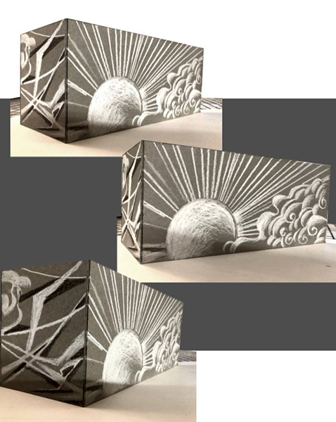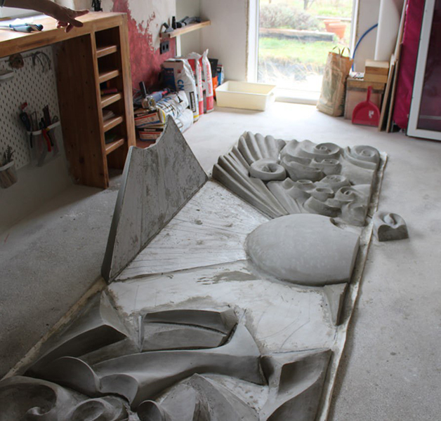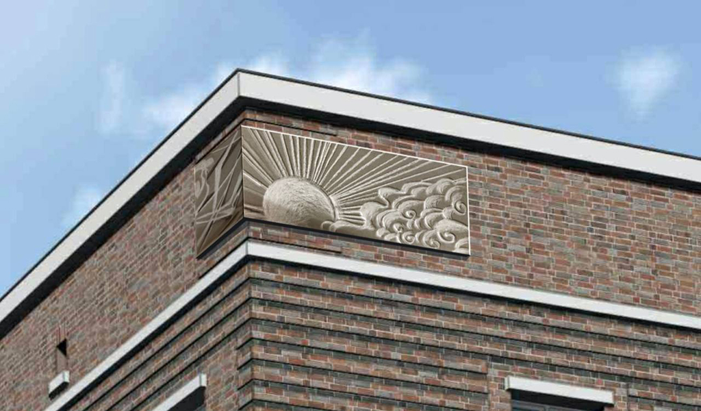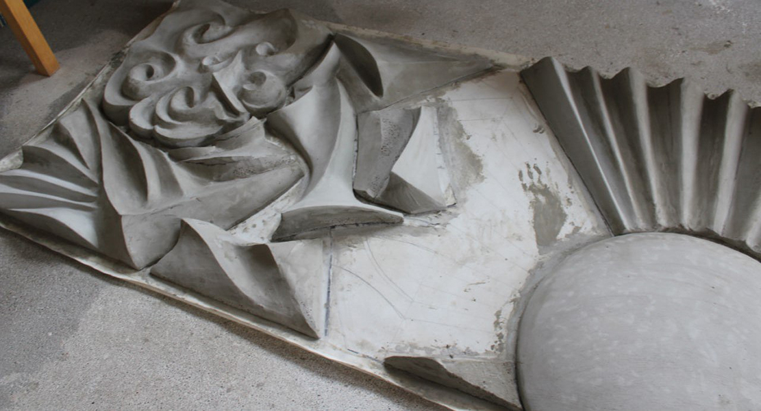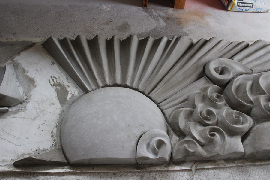 Скульптор создаёт угловое панно из бетона с изображением солнца, чаек и облаков. Также рабочим предстоит установить балконные ограждения и озеленить часть крыши над банком.