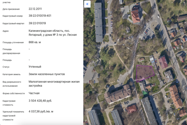 Строительство запланировано на участке с кадастровым номером 39:22:010019:401 у дома № 3 на ул. Лесной. Площадь участка составляет 868 кв. м, а стоимость по кадастру — 3 504 428,48 руб. Согласно данным публичной кадастровой карты, участок предназначен под малоэтажную многоквартирную застройку. Разрешение на строительство действительно до 28 марта 2028 года.