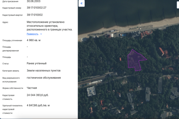 Строительство запланировано на участке с кадастровым номером 39:17:010002:27, по адресу: переулок Летний, дом 1. Уточнённая площадь участка составляет 4 960 кв. м, а стоимость по кадастру — 24 044 393,6 руб. Разрешение будет действительно до 27 мая 2028 года.