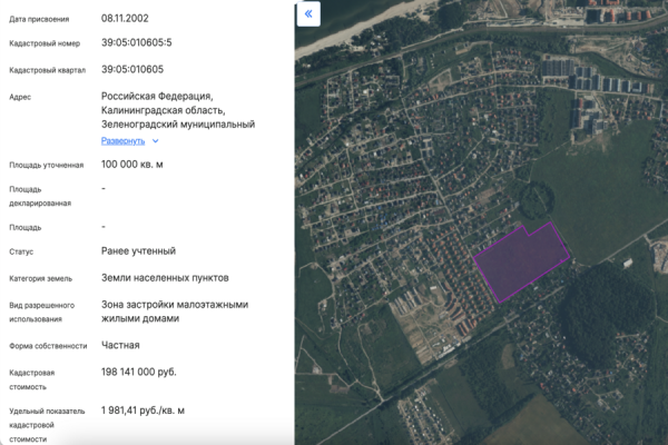 Ранее сообщалось, что вблизи Малиновки компания собирается построить 35 четырёхэтажных домов на участке с кадастровым номером 39:05:010605:5. Его уточнённая площадь составляет 100 000 кв. м, стоимость по кадастру — 198 141 000 руб.