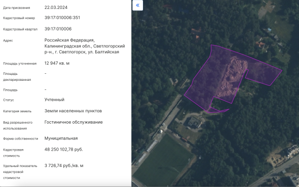 Строительство запланировано на участке с кадастровым номером 39:17:010006:351, предназначенном под гостиничное обслуживание. Его уточнённая площадь составляет 12 947 кв. м, а стоимость по кадастру — 48 250 102,78 руб. Кроме того, участок находится в муниципальной собственности. Разрешение будет действительно до 1 июля 2030 года.