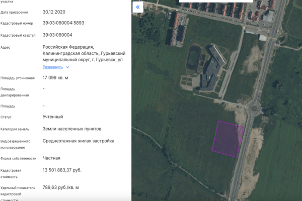 Строительство запланировано на участке с кадастровым номером 39:03:060004:5893, предназначенном под среднеэтажную жилую застройку. Его уточнённая площадь составляет 17 099 кв. м, а стоимость по кадастру — 13 501 883,37 руб. Разрешение будет действительно до 16 июля 2035 года.