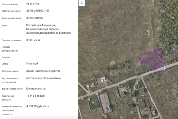 Строительство запланировано на участке с кадастровым номером 39:05:040602:1151, предназначенном под гостиничное обслуживание. Его уточнённая площадь составляет 3200 кв. м, а стоимость по кадастру — 13,1 млн руб. Разрешение будет действительно до 27 августа 2026 года.