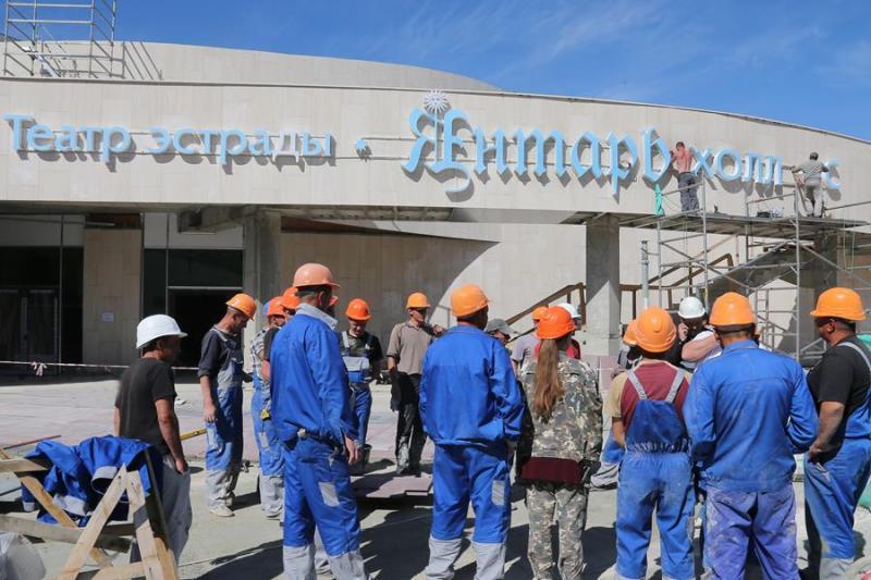 пресс-службе. Также идёт благоустройство территории — укладка плитки, установка освещения и оформление зелёных зон вокруг объекта. На фасаде театра уже появилась вывеска