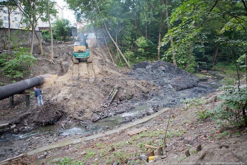 На пр. Мира в Калининграде на площадке бывшего кафе «Сказка» начались работы, в процессе которых строительная техника свалила грязь и глину в русло Паркового ручья, передаёт корреспондент «Нового Калининграда.Ru». На площадке около ручья сейчас работают несколько человек и экскаватор. Строительный мусор вперемешку с глиной и землёй сползает по откосу в воду.