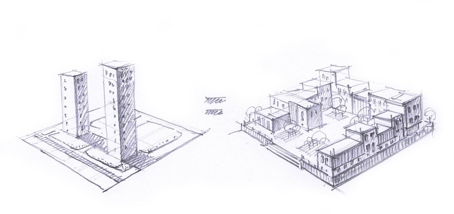 Когда я прихожу к ним в мастерскую в гости, пью кофе и веду беседы с отцами-основателями «о насущной повестке дня», то меж кофе и бесед узнаю много интересного, чего не прочтёшь в журналах и не увидишь по телевизору. Здесь я впервые узнал, что многоэтажка-свечка с участком земли по «полезному выходу квадратных метров» практически совпадает с домом-кварталом средней этажности (4-5) на этом же участке. То есть можно и не тыкать «свечки», а проектировать, как в Копенгагене и в историческом Санкт-Петербурге, соблюдая традиционный принцип квартальной застройки!