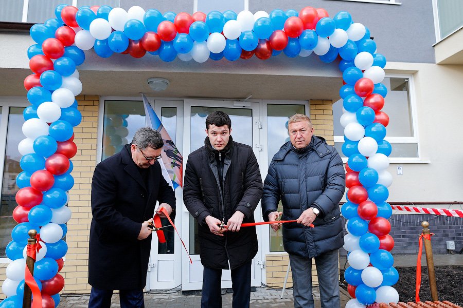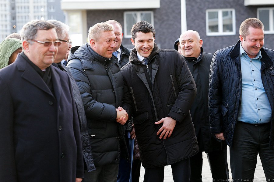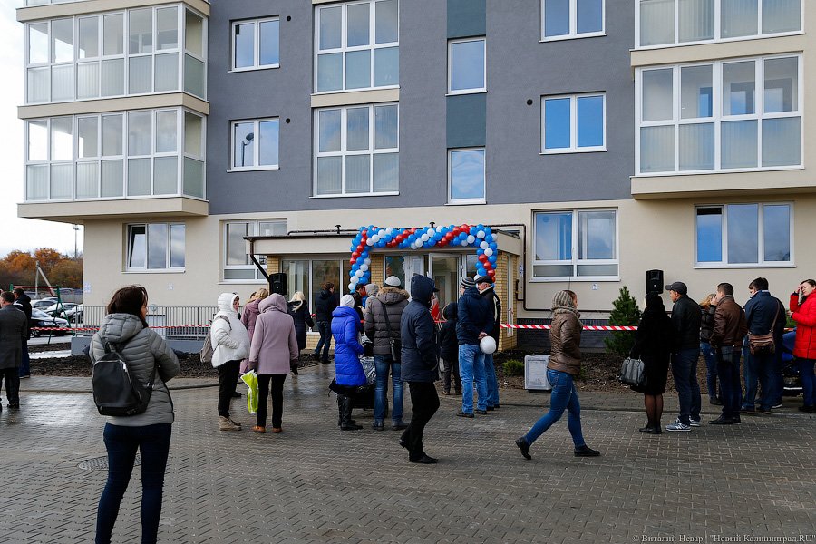 В конце концов начинается торжественная часть. Врио губернатора Антон Алиханов радуется погоде, сдаче дома, работе областного правительства, банка «Российский капитал» и федерального Минстроя. Следом ведущий объявляет торжественного гостя — мэра Калининграда Александра Ярошука, но слово даёт замглаве Минстроя РФ Олегу Бетину. Уже сделавший шаг к микрофону Ярошук возвращается обратно в ряды чиновников под дружный хохот вип-персон. Вручать ключи и кромсать ленточку позже его вытаскивают чуть ли не за рукав.