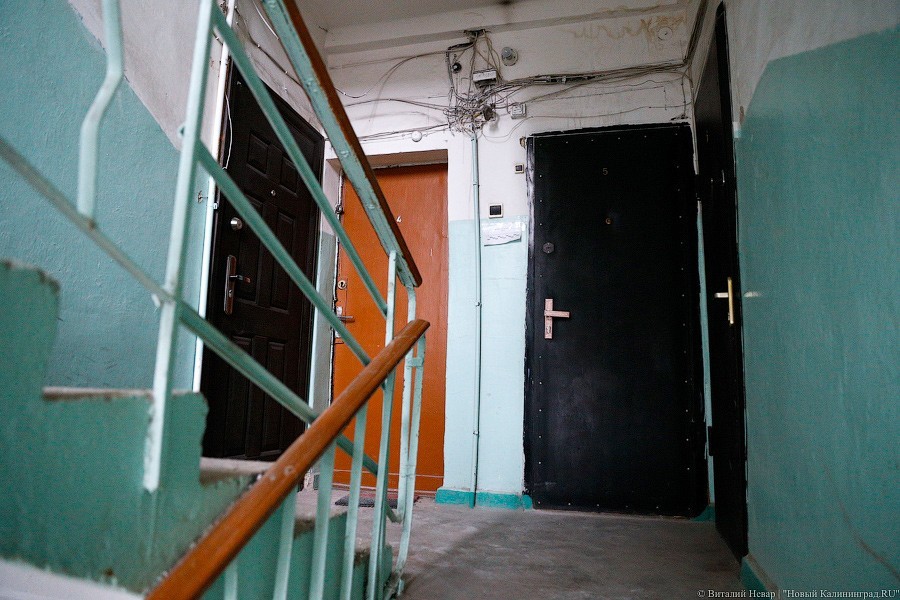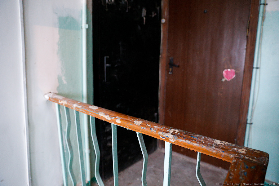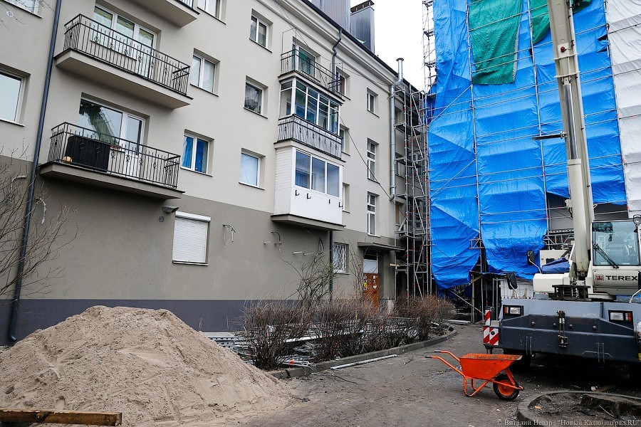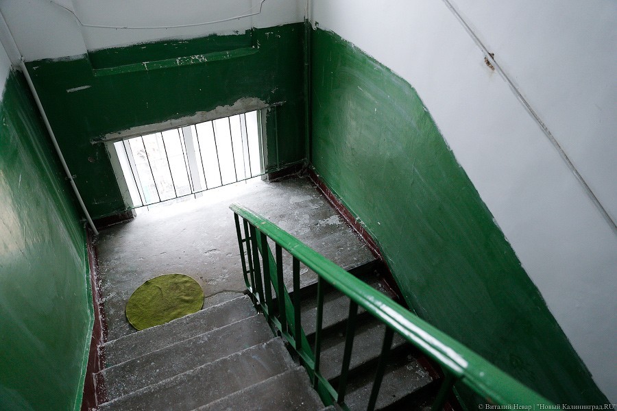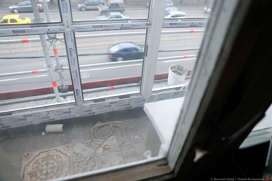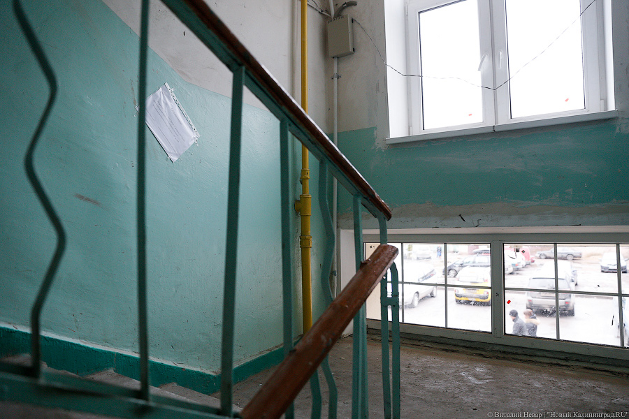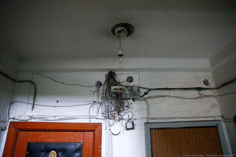 Тот самый дом на Ленинском проспекте, 2–4, прославившийся на всю Россию, встречает свежим фасадом «в ганзейском стиле» и подъездами в советском стиле. Внутри ещё видны следы ремонта — мусор на площадках, разводы на стенах. Здесь, когда сняли крышу, затопило верхние этажи. Жильцы жаловались главе горсовета Андрею Кропоткину. В итоге подрядчик обещал компенсировать убытки за свой счёт.