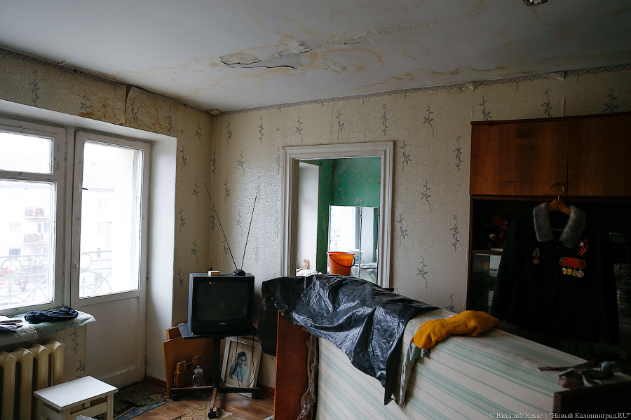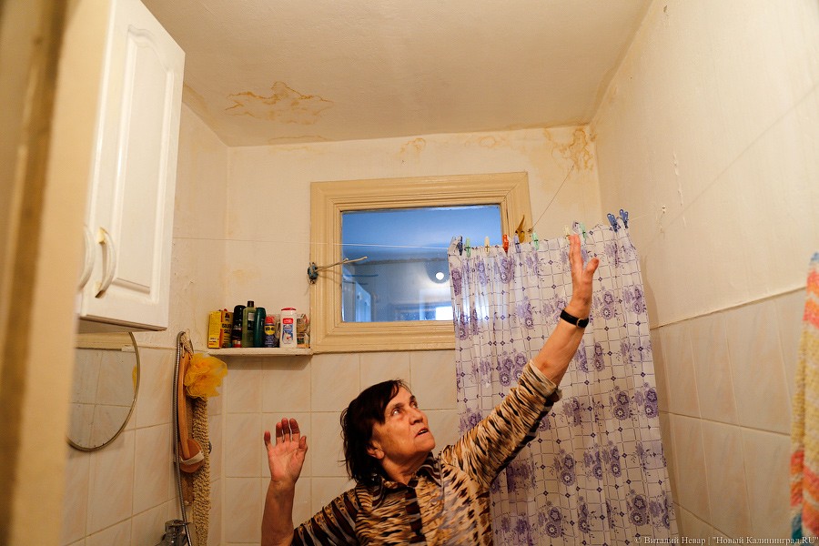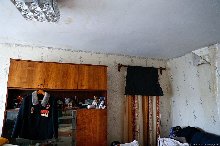 У её соседки — участницы Великой Отечественной войны Валентины Ивановны — дела обстоят не лучше, тут уже даже и не до красоты в подъезде. «Красивый дом, а здесь видите — всё плыло. Как по морю ходили. Всё залито, аж шубой встало», — демонстрирует она последствия замены крыши. Несколько лет назад Валентина Ивановна уже пережила один потоп — тогда проблемы случились