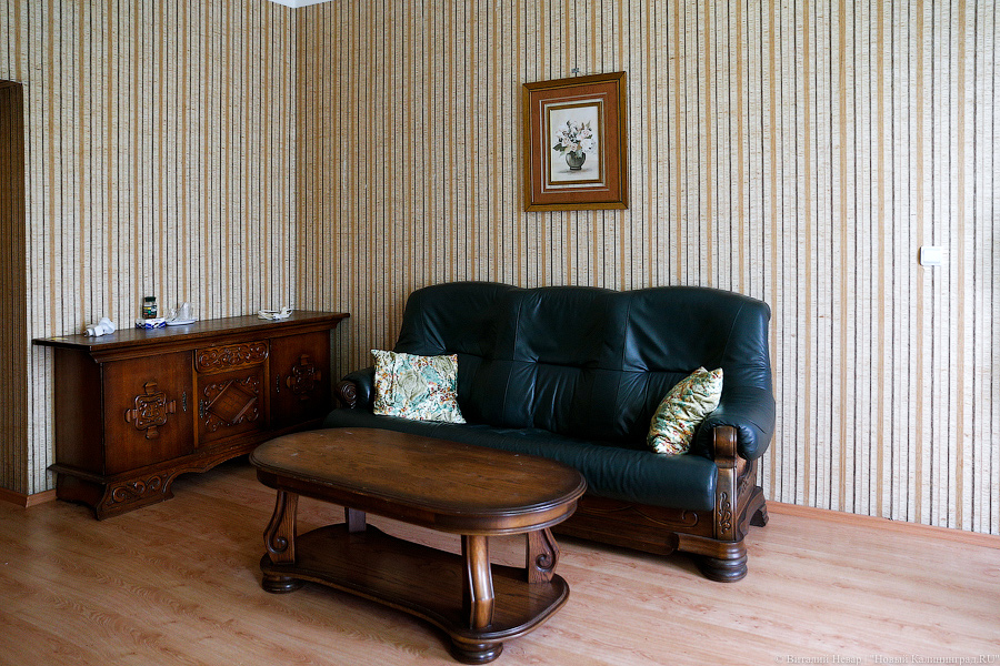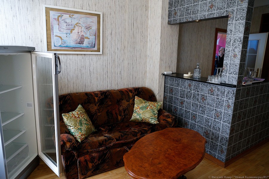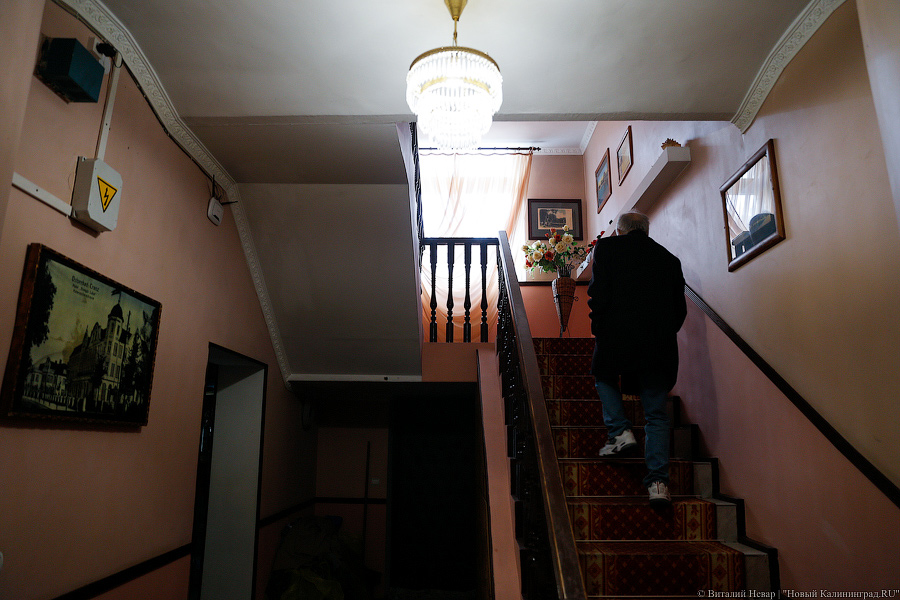 Эти времена давно позади. Мы заходим внутрь: стены обтянуты тканью, на лестницах и в пустых коридорах — ковровые дорожки; вот портреты королевы Луизы, прусской красавицы; вот картины, старые фотографии, оленьи головы и камин. Дорожки заботливо накрыты лентами обоев, в номерах — где-то кожаные диваны, где-то «мамин» шкаф и «пузатый» телевизор; из ванной, куда приглашает заглянуть заботливый хозяин, так и не были убраны полотенца. Пыли почти нет. Кровати застелены цветастыми покрывалами, на окнах — сиреневый, синий, желтый капрон; этот пронзительный калейдоскоп, несмотря ни на что, кажется милым.