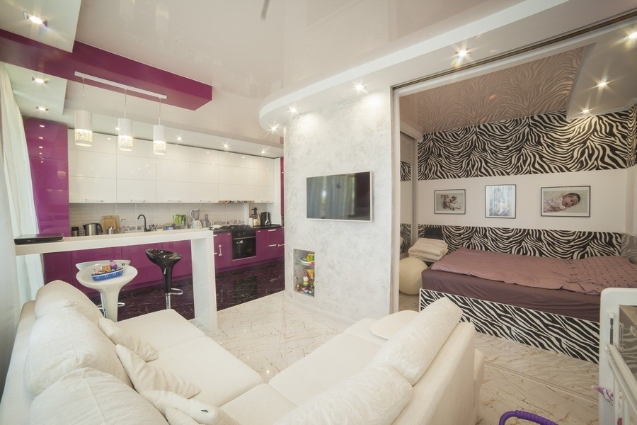 Во-первых, это соединение контрастных текстур: глянца и мата. Потолки, выполненные в таком сочетании, выглядят эффектней и выше.