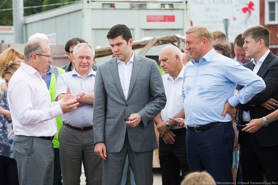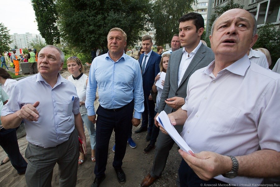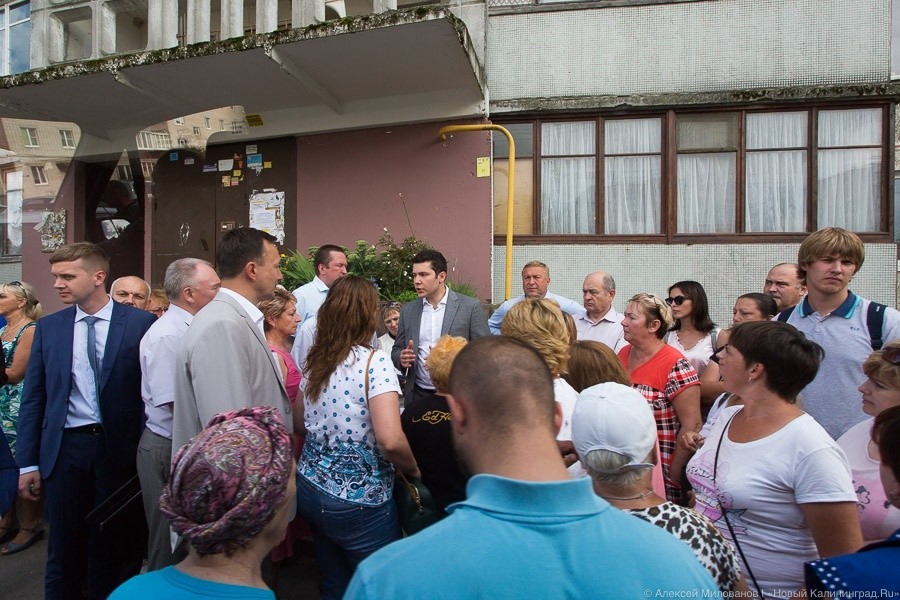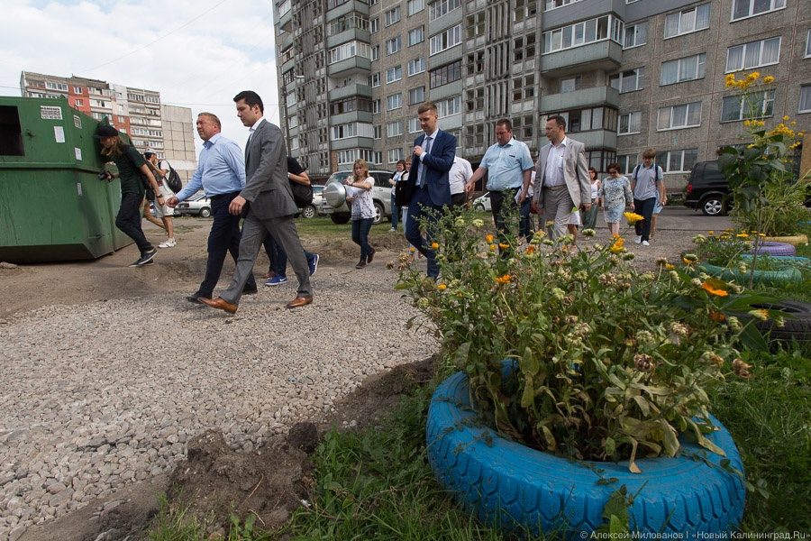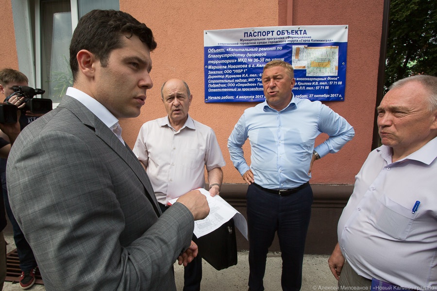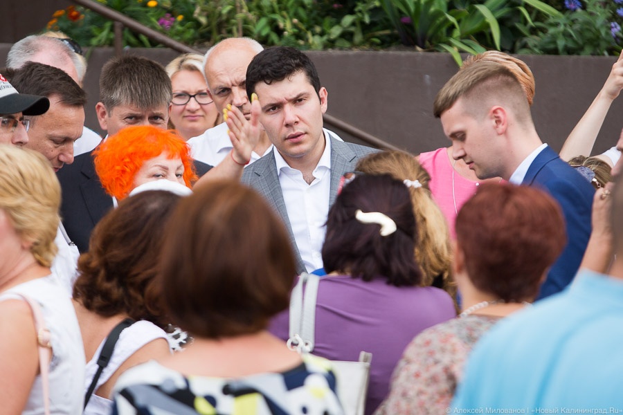 По двору уже прогуливаются несколько десятков калининградцев, некоторые между собой решают, кто будет говорить. Врио губернатора осматривает ремонтируемый двор, уточняет у подрядчика, как будет решаться вопрос с дренажом и хватит ли на всех жителей парковочных мест. Затем собирается уже уходить, но оказывается в плотном кольце просителей, которые активно суют ему в руки целые папки с письмами и документами. Здесь и жители дома на Павлика Морозова, утверждающие, что дом их аварийный, и жители Шпандина, едва догнавшие главу региона, с жалобой на то, что у них перекопали весь район, и даже калининградка, требующая решить вопрос с открывшимся в её доме хостелом. Через несколько минут Антону Алиханову