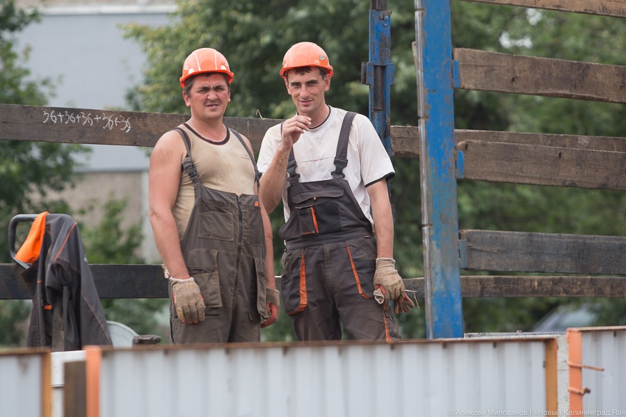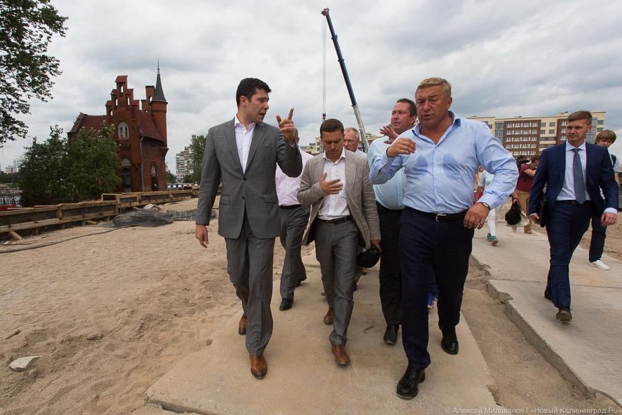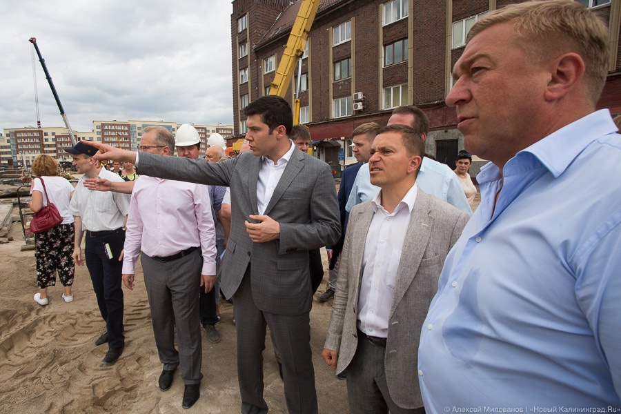 Добежав почти до Багратиона, глава региона притормаживает, чтобы дать поручение — использовать при строительстве объектов калининградские материалы, а не заказывать кирпич у немцев. «Вы технические требования к этому кирпичу внутри такие зашиваете, что можно купить только немецкий, а с местными производителями кирпича даже не поработали, может, они и такой могут производить. При этом у нас стоит забитый склад. Немцам помогли, молодцы!» — хмурит брови Алиханов. А затем разворачивается и собирается бежать обратно, но его останавливают подчинённые, сообщающие, что ему не туда. Несколько секунд врио губернатора выглядит растерянным, но быстро собирается и уже почти бежит к следующей точке (спортивной площадке на территории школы № 12), но теперь едва не врезается в стену журналистов, требующих прокомментировать мосты (далеко не все представители СМИ собирались весь день тратить на гастроли молодого врио).