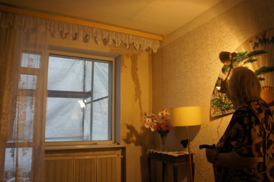 Жительница соседнего подъезда — одинокая пенсионерка, не пожелавшая называть своё имя, к сложившейся ситуации относится весьма эмоционально. Это неудивительно, учитывая, что вода в ее квартире льётся прямо с люстры. «Они приехали, крышу содрали! Вы представляете, с какого огромного дома сразу сняли крышу? Тут дожди — сразу полило. И сколько дожди, столько заливает весь дом до первого этажа. Бегая вот так с тазиками, я спасала нижние этажи. По неделям не выходила, чтобы собрать воду. В соседнем подъезде всё до первого этажа залито. И дальше — залито, залито, залито», — рассказала пенсионерка.