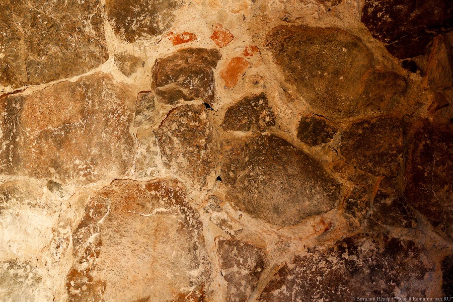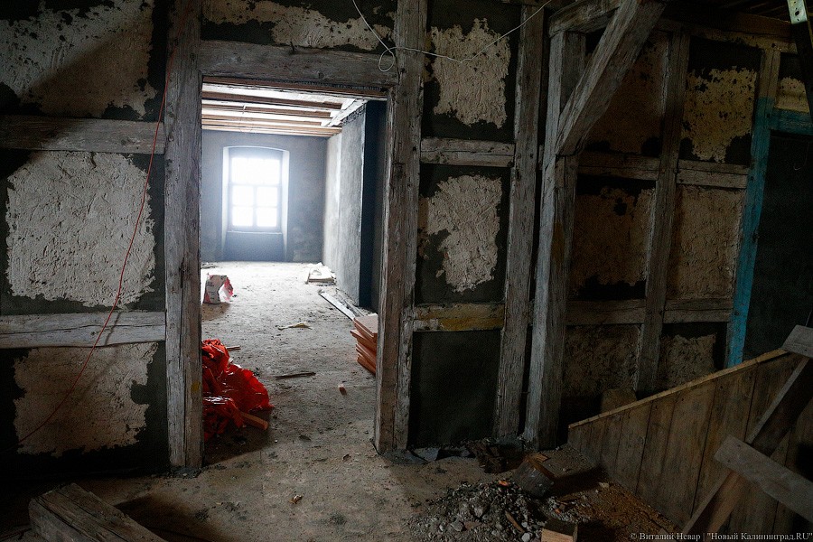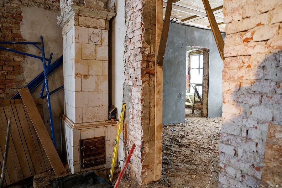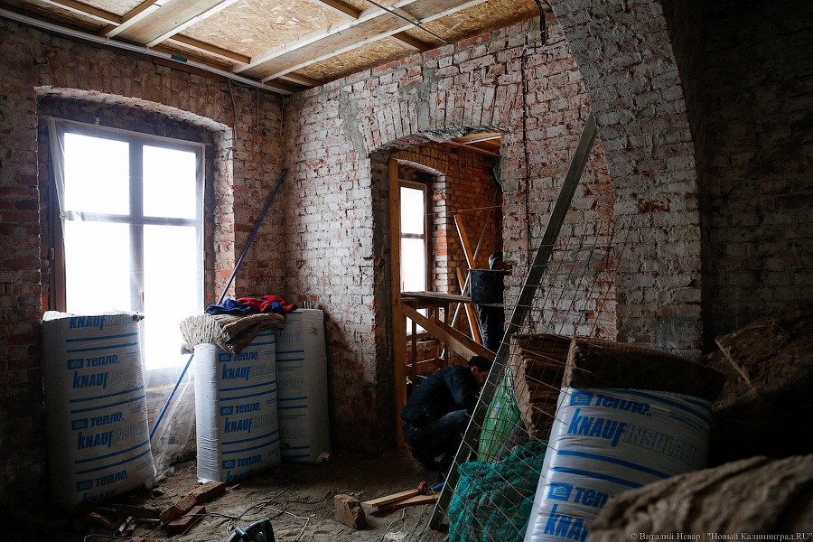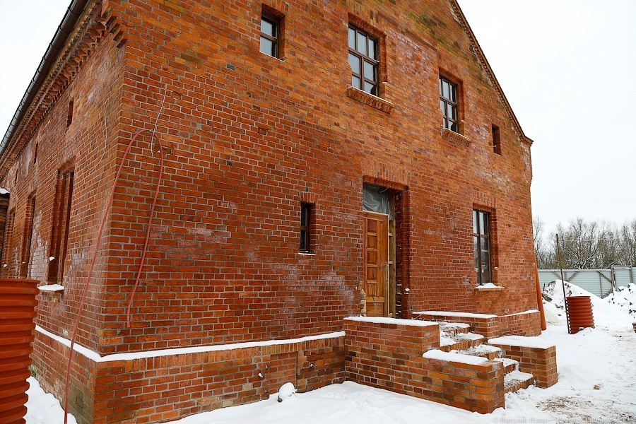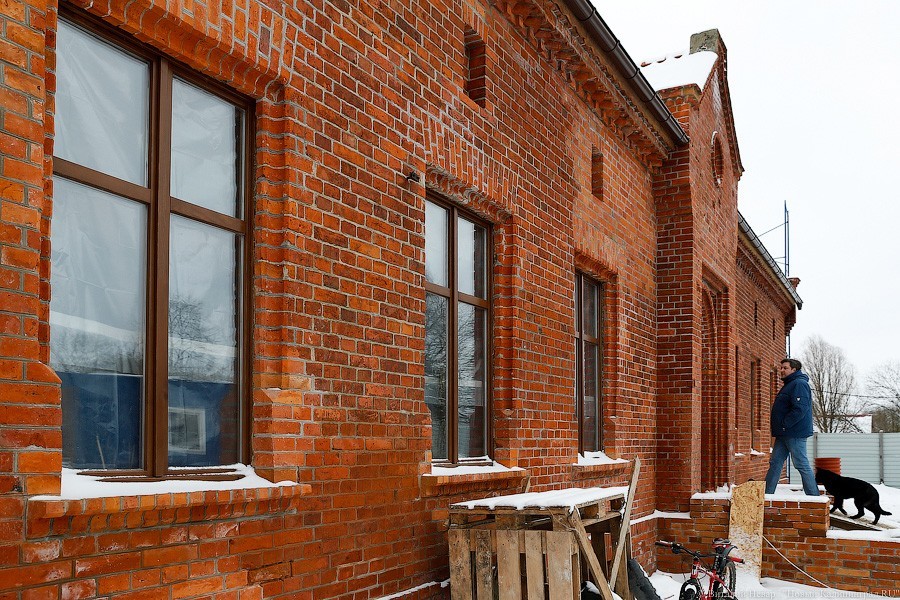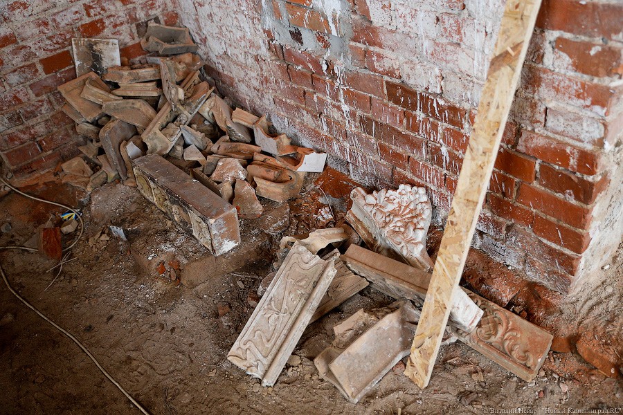 Часть здания реставраторам пришлось перекладывать полностью — за годы запустения торцевая стена начала жить своей увлекательной и опасной жизнью. Сначала ее хотели вернуть под родимый кров с помощью листов железа, но от этой идеи пришлось отказаться. «Донорами» кирпича для восстановления утраченных частей кладки стали местные здания с менее счастливой судьбой и более унылой биографией. «Кирпич мы используем от местных разобранных домов, чтобы сохранить расшивку. Новый не подойдет, он другого размера, и швы пошли бы враскос», — пояснил «Новому Калининграду» генеральный директор