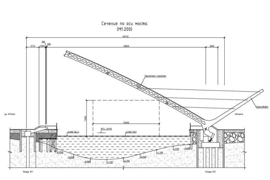 «Для уменьшения вылета консоли в разведенном состоянии применены вантовые подвески, которые одним концом поддерживают пролетное строение, что позволяет обеспечить его малую высоту, а другим анкеруются в пилоне, который жестко соединен с пролетным строением и составляет единую систему при разводке моста. Противовес разводного пролета расположен на пилоне. Для визуального облегчения конструкции противовес выполнен не в виде сплошного блока, а в виде фермы», — пояснил Теравский. Механизм разводки планируется установить в опору со стороны острова Канта, с этой же стороны установлен пилон, который будет опускаться при разведении моста.