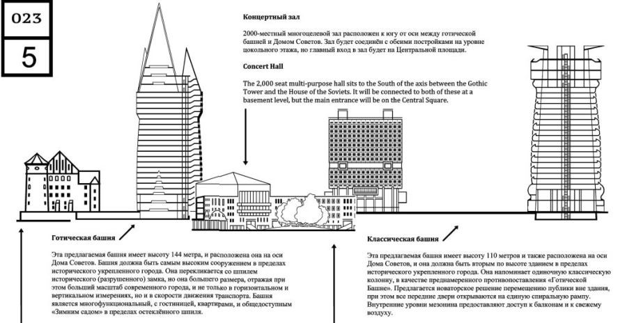 Говоря о застройке территории у Дома Советов, Антон Алиханов вспомнил проекты десятилетней давности, которые возили на выставку MIPIM в Каннах ещё при губернаторе Георгии Боосе. Тогда в 2007 году продвигали идею главного архитектора Александра Башина построить около самого высокого здания в городе ещё более высокие здания. Квартал небоскрёбов в народе быстро окрестили «башнями Башина». К 2008-му году башни исчезли — их заменила невнятная, но всё равно достаточно плотная застройка, а мечтатели команды Бооса сосредоточились на исторической территории Альтштадта (сквер между Московским проспектом и Преголей). Ни одной из этих задумок не было суждено сбыться, а вскоре область покинул и Георгий Боос, увезя с собой большую часть мегаломанских затей.